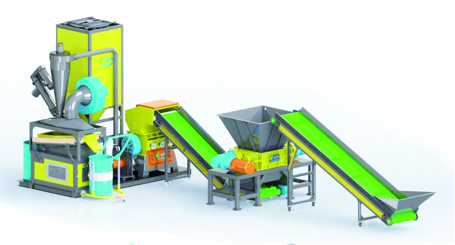 1.Double shafts shredder   2.Magnetic separator    3.High speed pulverizer/granulator   4. Dual-output gravity separator   5.Dedust system