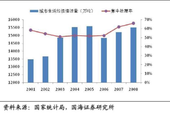 固體廢物可以分為工業(yè)固廢、生活垃圾及危險(xiǎn)廢物,而后者的數(shù)量比重很小。2001年至2009年間,工業(yè)固廢的產(chǎn)生量從約9億噸激增到約21億噸,年均復(fù)合增長(zhǎng)率達(dá)到12%。由于生活垃圾的產(chǎn)生量比較難統(tǒng)計(jì),在統(tǒng)計(jì)局給出的數(shù)據(jù)中一般用垃圾清運(yùn)量指標(biāo)來代替。生活垃圾的實(shí)際產(chǎn)生量約為清運(yùn)量的兩倍,且清運(yùn)比逐年上升趨勢(shì)。2001-2008年,城市垃圾產(chǎn)量復(fù)合增長(zhǎng)率為5%,而垃圾清運(yùn)量的增速僅為2.03%,整體來看,垃圾清運(yùn)的速度不及垃圾產(chǎn)生的速度,垃圾圍城現(xiàn)象出現(xiàn),垃圾處理問題開始引起民眾和政府的高度重視。截止2007年,我國未經(jīng)處理的城市生活垃圾累計(jì)堆存量已達(dá)70多億噸,侵占土地面積超過5億多平方米,全國660個(gè)城市中有約200個(gè)城市陷入垃圾包圍之中。深圳市創(chuàng)新投資集團(tuán)有限公司發(fā)展